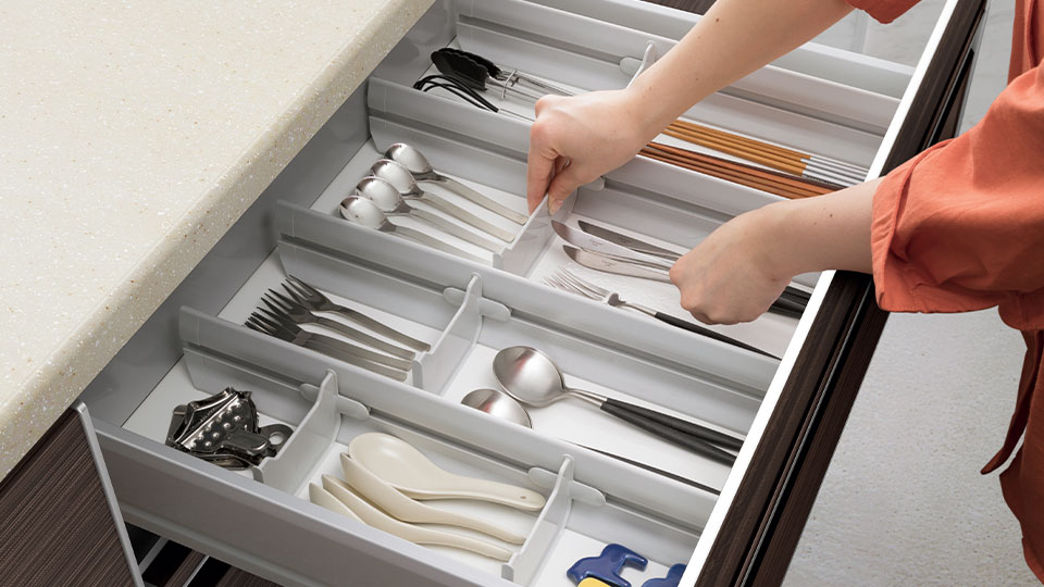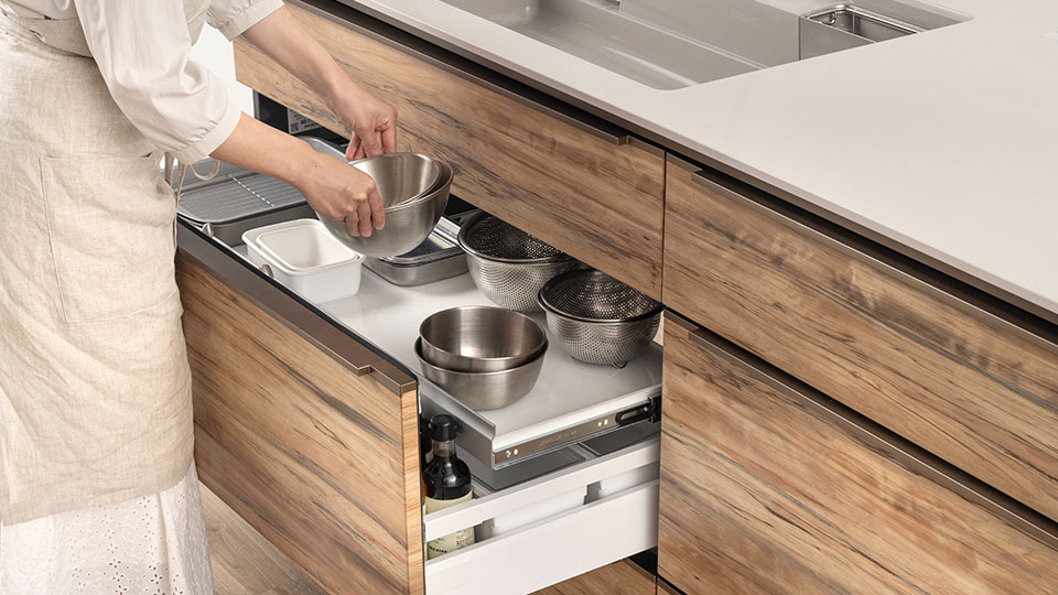 シンク、調理、コンロの3つのキャビネット全てで使えて、よく使うものを取り出しやすい位置に収納できます。